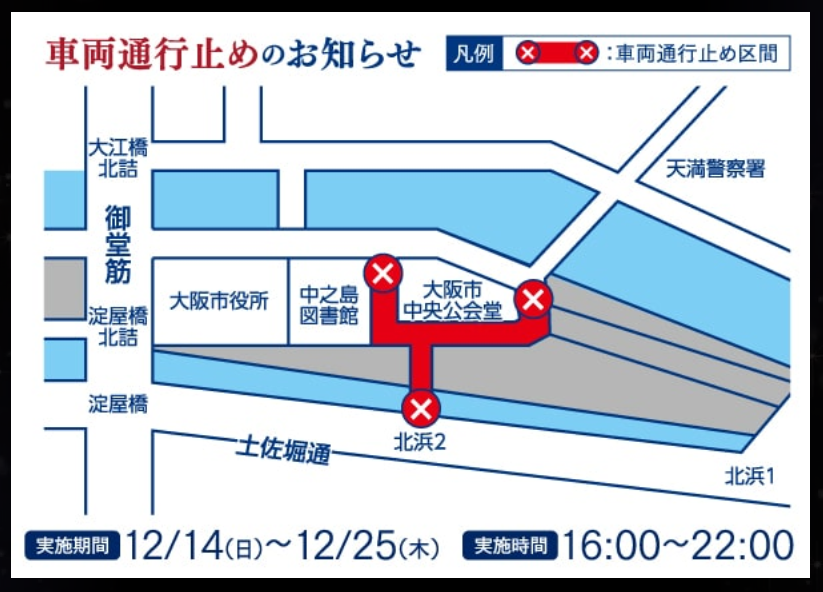 大阪市中央公会堂周辺道路では期間中一部時間において交通規制となり、車両通行止めとなります。
